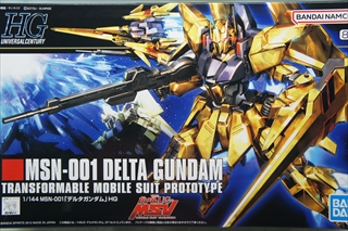 『機動戦士ガンダムUC』より、百式の真の姿、可変MS「デルタガンダム」がHGUCで登場。 百式と同じ金色の装甲は、光り輝くメッキパーツで再現。 差し替えパーツで飛行形態を完全再現。 大型ライフル、シールドのほか、ビーム・サーベル2本が付属。 成形品×9、ホイルシール×1、組立説明書×1